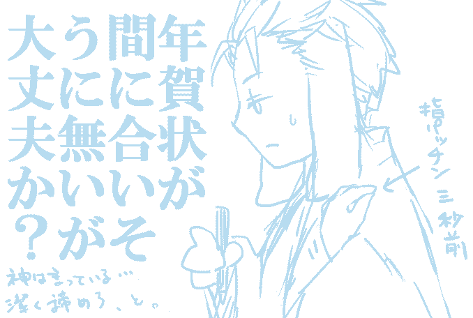 あとほんと年賀状これ無理だよ倒せないよシャダイMADが耳から離れないよ正直全てを諦めピクシヴという名の桃源郷に堕天したい。
