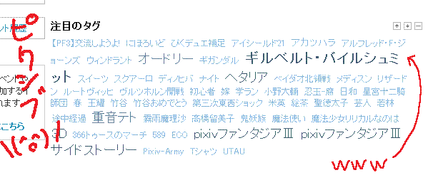 先日初めてピクシブ覗いたんですが、注目タグが大変なことになっていたので吹き出しました。